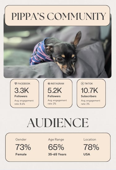 Pippa is the face of Pippa the Pip Squeak, where we create story-driven, lifestyle content designed to connect with dog lovers and inspire real purchasing behavior.