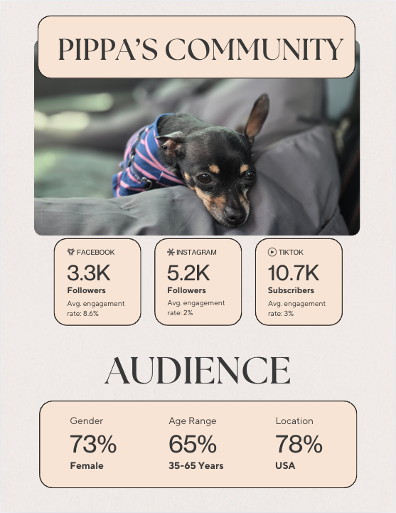 Through engaging lifestyle content, Pippa showcases pet products, toys, travel gear, nutritious food, and everyday adventures that resonate with dog lovers and pet parents.